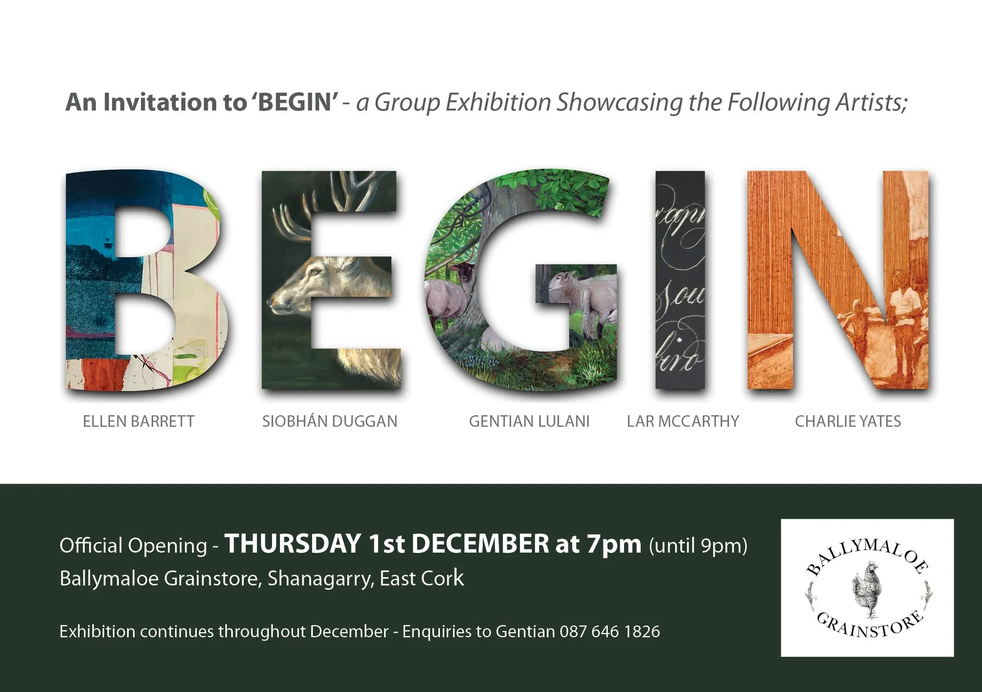 Begin’, a group exhibition displaying the work of 5 artists can be seen at the Grainstore Ballymaloe during the month of December. At the open evening on Thursday December 1st between 7and 9pm you have the opportunity to meet the following artists;
