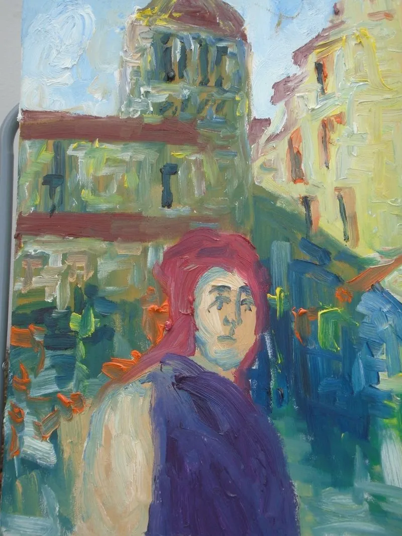 Mel is fascinated with colour and light, and also with architecture; the paintings are based on European cities that Mel has visited, with a portrait as a central theme (Mel loves travelling and has been to a number of European countries).