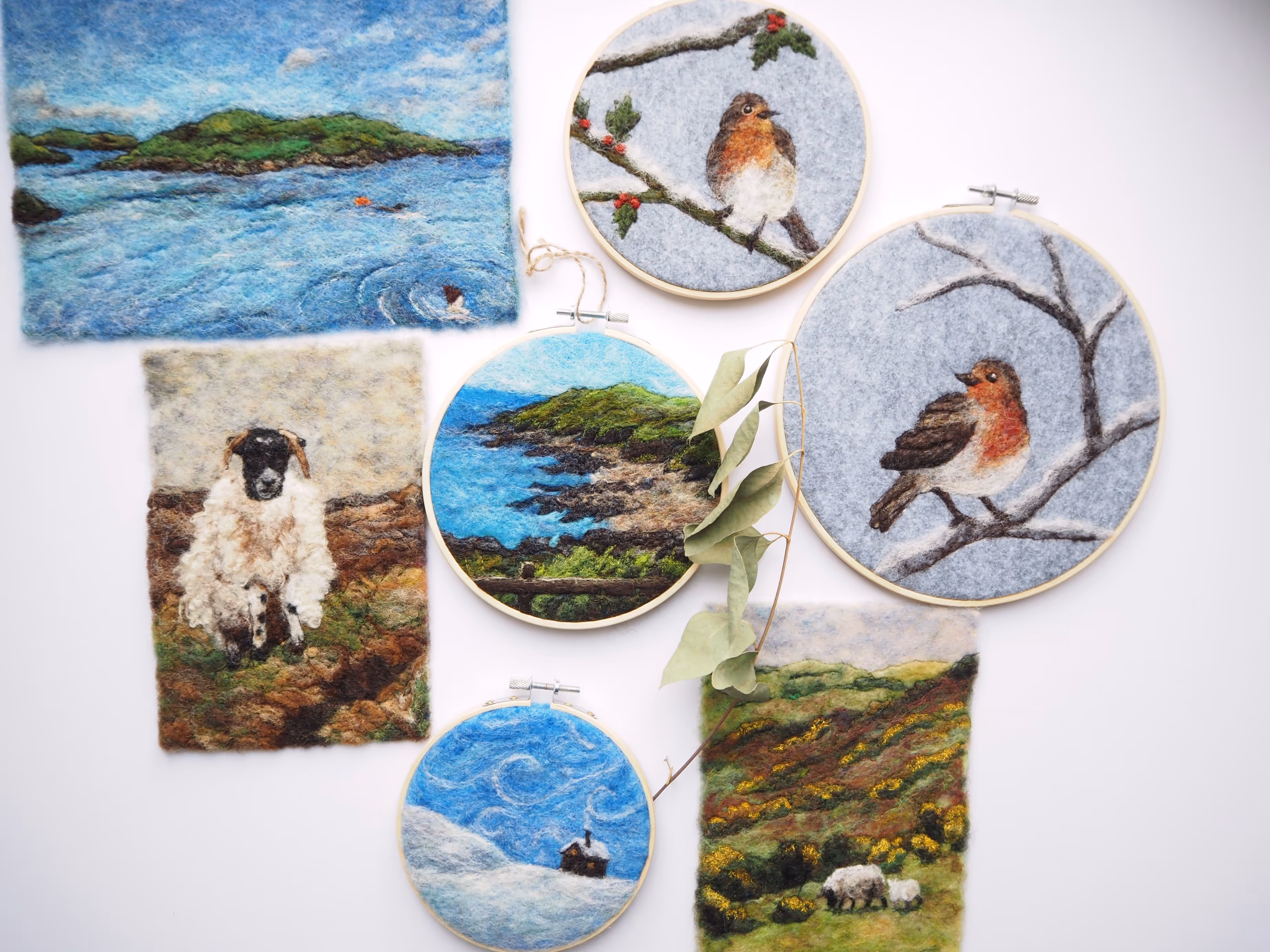 Emily Thompson is a textile artist who specializes in needle felting. Using locally sourced Irish wool, which is washed and dyed using natural materials, Emily meticulously layers the dyed wool to create images of the beautiful Irish landscape. She uses a needle felting tool, and the required technique, which consists of matting the woolen fibers together by repetitively pushing the fibers back and forth using the sharp barbed needle tool. Following this she uses both her sewing machine, and simple needle and thread to add further texture and detail to her works. She considers her dyed wool her ‘palette’ and felting needles her ‘paintbrush’.She is an active member of Cork Craft and Design, where she sells original works, prints (framed and unframed), various stationary products, and household items printed with her work.