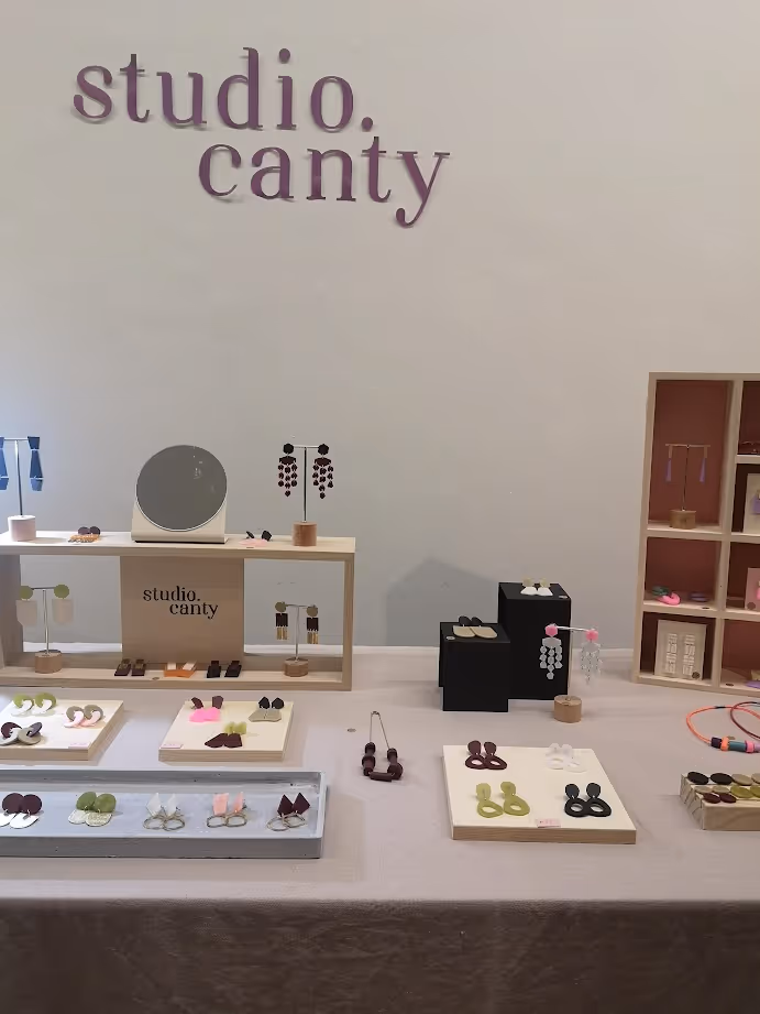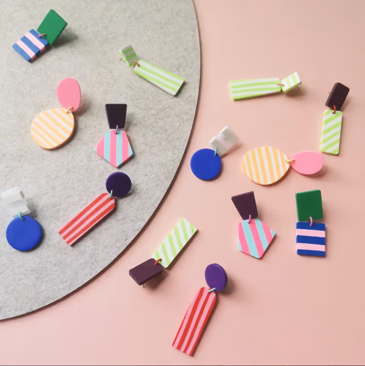 Colourful statement jewellery created from cured polymer clay slabs. Shapes are cut and carved out of these slabs to create mostly one off pieces.